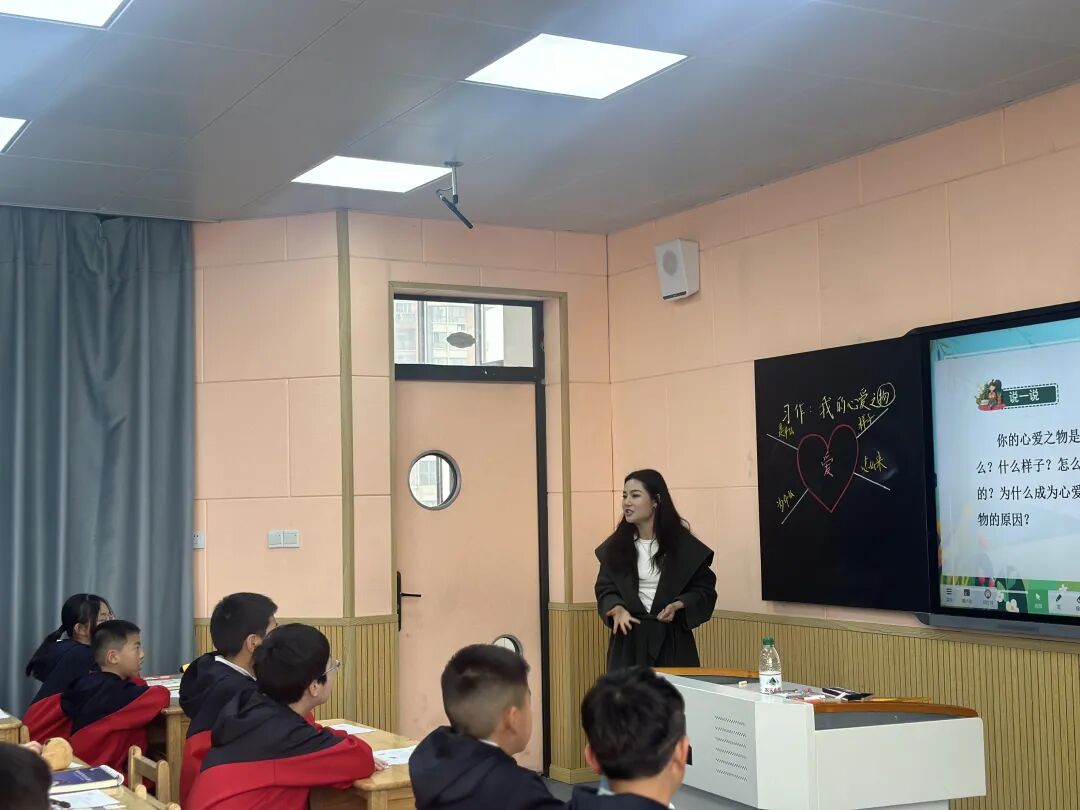 戴老师用和蔼亲切的语气引导学生介绍了自己的心爱之物,通过课文中学习过的写作方法,以教促学,让学生在说、学中获得必要的基础知识和基础技能,培养了学生实践能力和创新意识。
