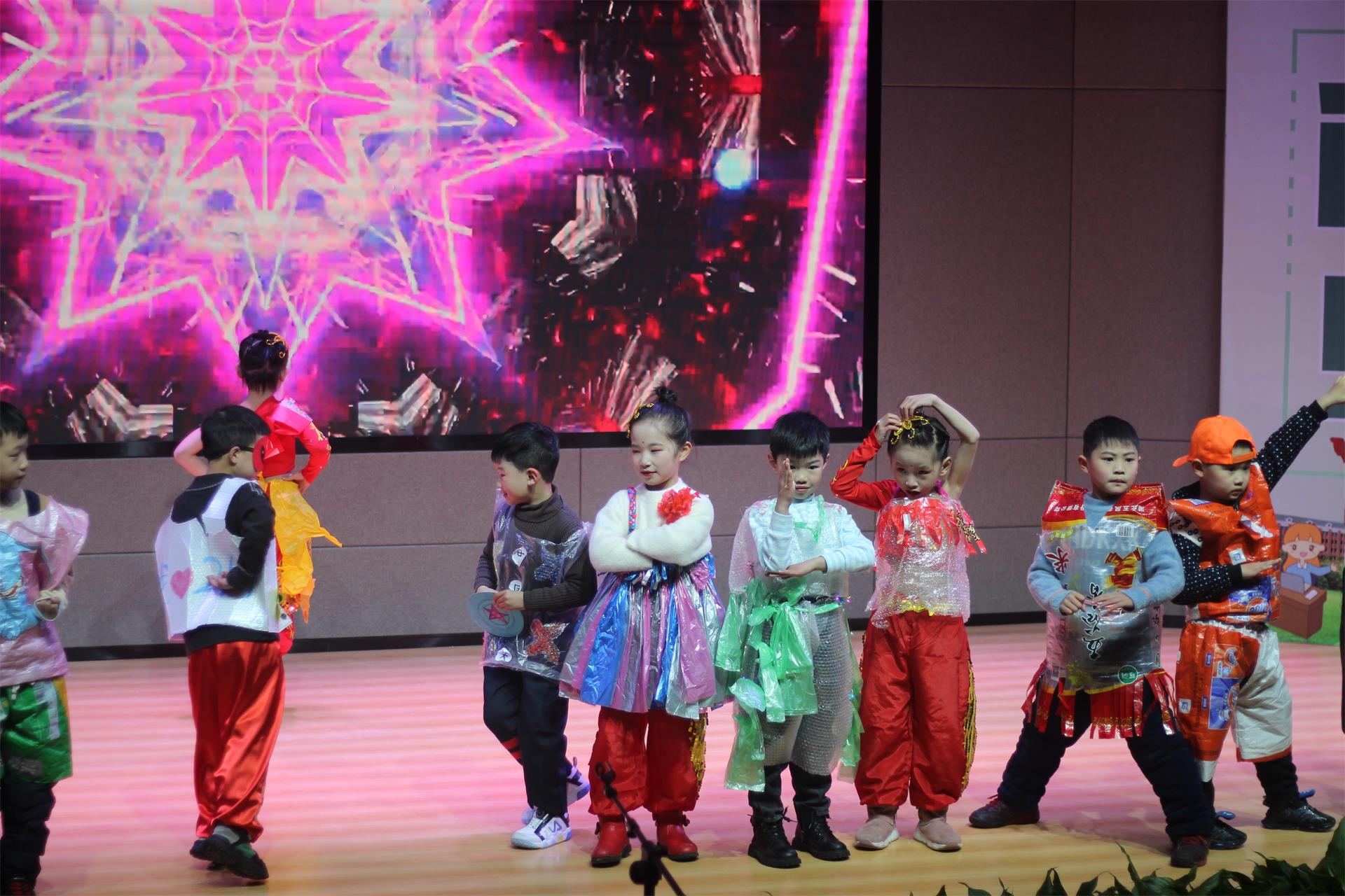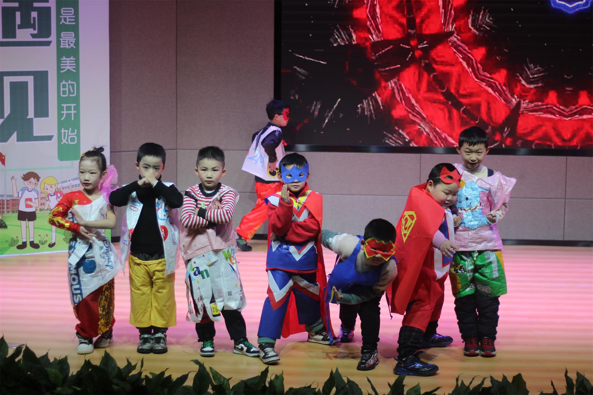 一年级的小可爱们穿上了和爸爸妈妈们亲手做的环保服装,在舞台上走出最自信的步伐。